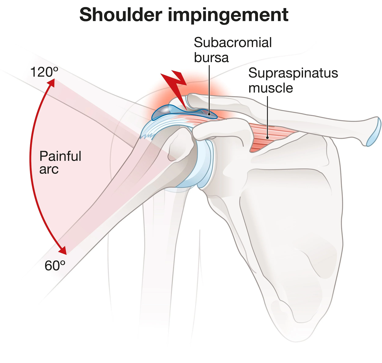 - سندرم گیر افتادگی شانه (Impingement Syndrome) : این وضعیت به فشردگی تاندونهای روتاتور کاف در زیر آکرومیون مربوط است. عوامل آن میتواند شامل شکل آکرومیون (مانند خار آکرومیال) یا شانههای افتاده و فعالیتهای مکرر بالای سر باشد. درگیری مزمن این فضا باعث درد هنگام بلند کردن بازو و التهاب تاندونها میشود.