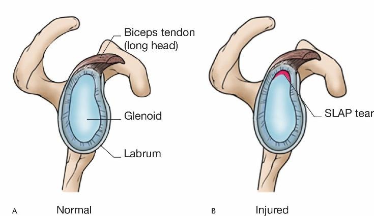 - آسیبهای لابروم (SLAP Lesions) : پارگی در ناحیه بالایی لابروم گِلنوئید که محل اتصال تاندون عضله دوسر بازویی است. این آسیب در ورزشکاران پرتابکننده (تنیسبازان، بیسبالیستها) یا در اثر افتادن روی دست صاف رخ میدهد. علامتها شامل درد عمقی جلوی شانه و ضعف در حرکت چرخشی است.