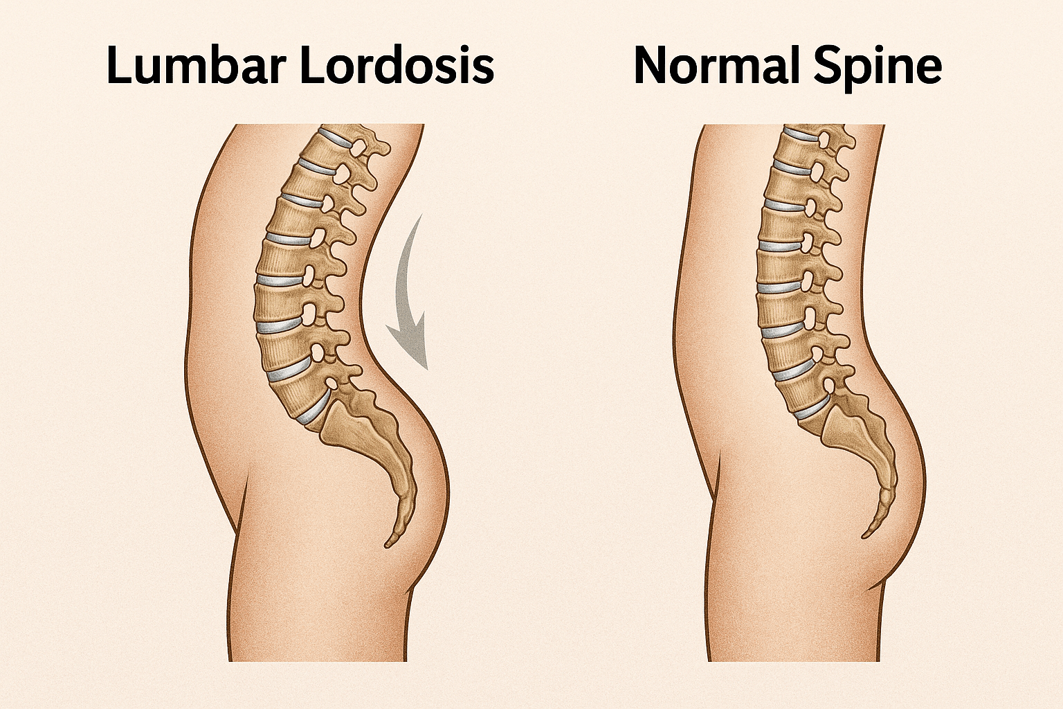 برای اصلاح لوردوز، باید ابتدا عضلات خمکننده لگن و اطراف مهره ها را کشش داد و همزمان عضلات شکمی و سرینی را تقویت کرد. تمرینات کششی مانند «کشش خمکننده لگن با زانو خم» و «کشش عضلات اطراف ستون مهره ها» ضروری است. در مقابل، تمریناتی مثل پل باسن (پل پا)، پلانک و کرانچ شکم عضلات شکمی و گلوتئال را تقویت میکنند. همچنین تقویت عضلات پشت پایین (کمر) در حد متعادل میتواند به حفظ انحنای صحیح کمک کند. یک مرور نظاممند اخیر نشان میدهد که تمرینات اصلاحی مؤثر هستند. نوری و همکاران (۲۰۲۲) در یک متاآنالیز گزارش دادند که تمرینات اصلاحی مختلف اثر مثبت متوسطی بر کاهش زاویه لوردوز کمری در بیماران لوردوز و هایپرلوردوز دارند. بنابراین، ترکیب متوازن تمرینهای کششی و تقویتی برای بازگرداندن گودی کمر به محدوده طبیعی توصیه میشود.