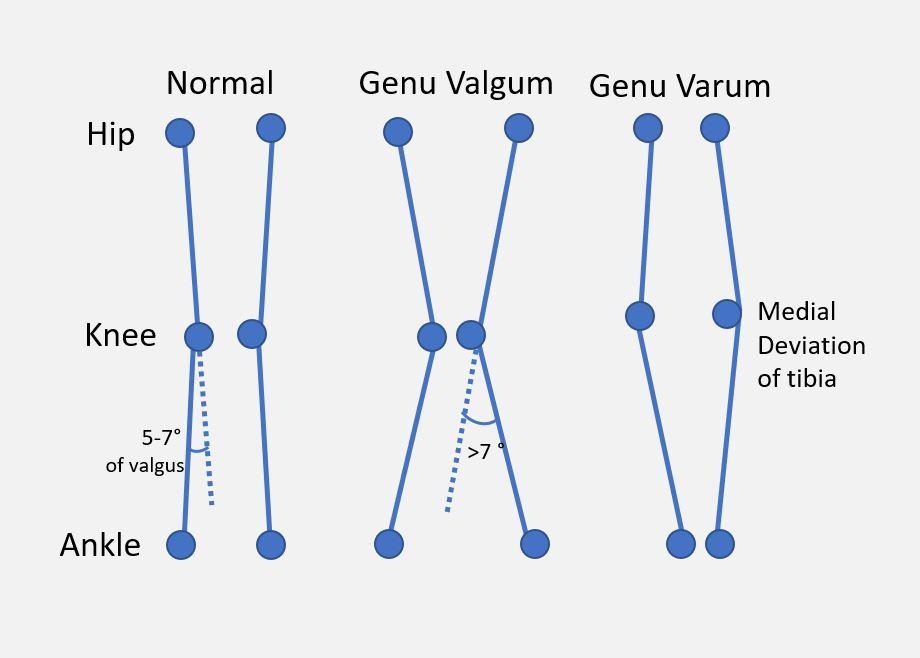 ژنووالگوم (زانوی ضربدری) وضعیتی است که در آن زانوها به سمت داخل متمایل میشوند و مچها از هم فاصله میگیرند. این وضعیت معمولاً در کودکان تا حدود ۶-۷ سالگی طبیعی است و در صورت استمرار پس از آن نیاز به بررسی دارد. ژنوواروم (پرانتزی) عکس آن است یعنی زانوها فاصله میگیرند و مچها به هم نزدیک میشوند. در اوایل کودکی نیز کمی پرانتزی بودن طبیعی است و تا سن ۲-۳ سالگی برطرف میشود، اگر ادامه یابد، میتواند ناشی از بیماریهای استخوانی مانند بلانت باشد.