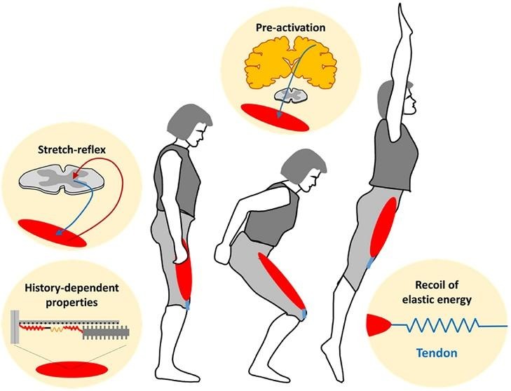 از دیدگاه فیزیولوژیک، پلیومتریک با استفاده از منحنی طول-تنش عضله و بهکارگیری حداکثر اتصالات اکتین و میوزین در فیبرهای عضلانی، نیروی انفجاری تولید میکند. همچنین مطابق اصل Elftman (Elftman’s Force–Velocity Principle) بیشترین نیرو در انقباضات اکسنتریک تولید میشود و کمترین آن در کانسنتریک. بنابراین وجود یک فاز اکسنتریک سریع پیش از انقباض کانسنتریک، شرایط را برای تولید نیروی بیشتر در فاز کانسنتریک فراهم میکند. در همین راستا، هرچه فاز آمورتیزاسیون (مرحله بین انقباض کششی و انقباض انفجاری) کوتاهتر باشد، اتلاف انرژی الاستیک کمتر شده و توان تولیدی بیشتر میشود.
