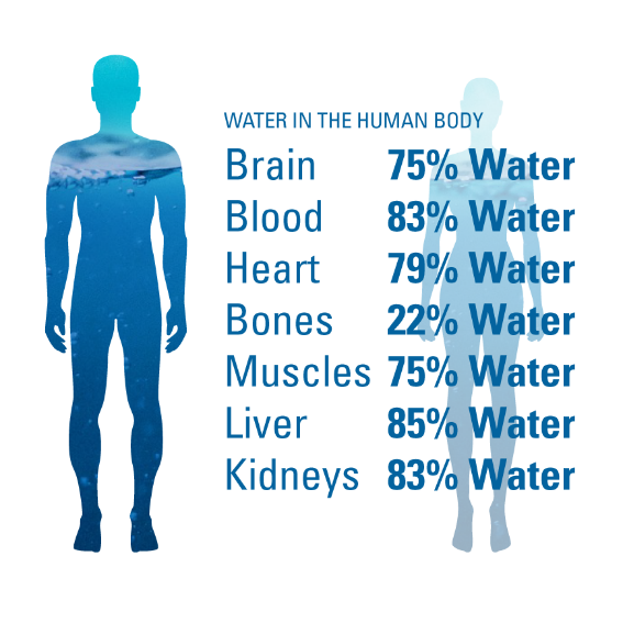 آب حدود ۶۰٪ وزن بدن بزرگسالان را تشکیل میدهد. این آب بهطور عمده در دو بخش درونسلولی (≈۶۵٪) و برونسلولی (≈۳۵٪) توزیع شده است. آب برای عملکرد طبیعی سلولها و بافتها حیاتی است. به عنوان مثال حدود ۷۵٪ بافت عضله از آب تشکیل شده است، درحالیکه بافت چربی تنها ≈۱۱٪ آب دارد.آب حجم سلولی را حفظ میکند و در واکنشهای متابولیک، انتقال مواد مغذی و دفع فرآوردههای متابولیکی نقش دارد.
